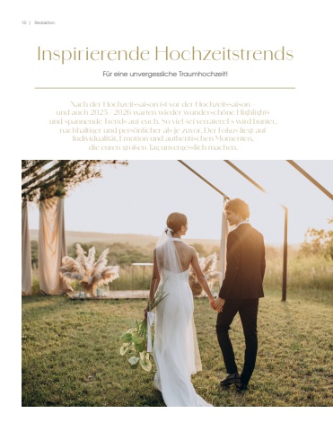 10 | RedaktionInspirierende HochzeitstrendsF%u00fcr eine unvergessliche Traumhochzeit!%u00a0Nach der Hochzeitssaison ist vor der Hochzeitssaison %u2013 und auch 2025 / 2026 warten wieder wundersch%u00f6ne Highlights und spannende Trends auf euch. So viel sei verraten: Es wird bunter, nachhaltiger und pers%u00f6nlicher als je zuvor. Der Fokus liegt auf Individualit%u00e4t, Emotion und authentischen Momenten, die euren gro%u00dfen Tag unvergesslich machen.