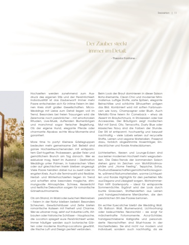 Redaktion | 11Hochzeiten werden zunehmend zum Ausdruck des eigenen Stils und der Pers%u00f6nlichkeit. Individualit%u00e4t ist das Zauberwort! Immer mehr Paare entscheiden sich f%u00fcr intime Feiern im kleinen Kreis statt gro%u00dfer Gesellschaften. MicroWeddings mit Liebe zum Detail liegen voll im Trend. Besonders bei freien Trauungen wird die Zeremonie noch pers%u00f6nlicher %u2013 mit emotionalen Ritualen, Live-Musik, duftenden Blumenb%u00f6genund manchmal sogar tierischer Begleitung. Ob der eigene Hund, elegante Pferde oder charmante Alpakas: echte Wow-Momente sind garantiert.More time to party! Kleinere G%u00e4stegruppenbedeuten mehr gemeinsame Zeit. Beliebt sind ganze Hochzeitswochenenden mit entspanntem Get-together, Probeessen, gro%u00dfer Feier und gem%u00fctlichem Brunch am Tag danach. Wer es exklusiver mag, feiert im Ausland %u2013 Destination Weddings unter Palmen, in toskanischen Villen oder auf griechischen Inseln bleiben angesagt. Viele Paare heiraten dabei nur zu zweit oder im engsten Kreis. Auch die Terminwahl wird flexibler. Herbst- und Winterhochzeiten liegen im Trend und schaffen eine besonders magische, stimmungsvolle Atmosph%u00e4re. Schnee, Kerzenlicht und festliche Dekoration sorgen f%u00fcr romantische G%u00e4nsehautmomente.Ob am Strand, im Wald oder zwischen Weinreben %u2013 Feiern in der Natur bleiben beliebt. Besonders Scheunen, Gew%u00e4chsh%u00e4user und Zelte bieten romantische Kulissen mit Freiheit und Charme. Wer es urbaner mag, setzt auf Industrie-Lofts, Altbauten oder historische Schl%u00f6sser %u2013 Hauptsache, die Location spiegelt eure Pers%u00f6nlichkeit wider. Immer h%u00e4ufiger werden auch botanische G%u00e4rten oder moderne Rooftop-Locations gew%u00e4hlt, die frische Luft und Design perfekt verbinden.Beim Look der Braut dominieren in dieser Saison Boho-Elemente, Clean Chic und moderner Minimalismus. Luftige Stoffe, zarte Spitzen, elegante Beinschlitze und schlichte Silhouetten pr%u00e4gen das Bild. Kombiniert wird mit soften Farbnuancen wie Ivory, Champagner oder Blush. Auch Metallic-T%u00f6ne feiern ihr Comeback %u2013 etwa als Akzent im Brautschmuck, in Stickereien oder bei Accessoires. Der Br%u00e4utigam zeigt modischen Mut mit Sand, Oliv, Terracotta, Dusty Blue oder klassisches Navy sind die Farben der Stunde. Der Stil ist entspannt, hochwertig und bewusst nachhaltig %u2013 viele Labels setzen auf recycelteStoffe, Leinen und vegane Materialien. Passenddazu, farblich abgestimmte Hosentr%u00e4ger, Einsteckt%u00fccher und florale Ansteckblumen.Lichterketten, Kerzen und Lounge-Ecken sind aus keiner modernen Hochzeit mehr wegzudenken. Die Deko-Trends der kommenden Saisonstehen ganz im Zeichen von Wohlf%u00fchlatmosph%u00e4re und %u201eHome Feeling%u201c. Teppiche, Sofas,Poufs und Sessel schaffen gem%u00fctliche R%u00fcckzugsorte, w%u00e4hrend Naturmaterialien, warme Lichtquellen und florale Highlights f%u00fcr den perfekten Mix aus Eleganz und L%u00e4ssigkeit sorgen. WohnzimmerFlair trifft Gartenparty %u2013 ideal f%u00fcr entspannte Sommern%u00e4chte. Erg%u00e4nzt wird der Look durch bunte Glasvasen, Stoffservietten aus Leinen und handgeschriebene Men%u00fckarten, die den pers%u00f6nlichen Stil des Paares betonen.Ein echter Eyecatcher bleibt die Wedding Wall. Ob Balloon Wall, Blumenwand, Lichtvorhang oder beleuchtetes Neonschild %u2013 sie sorgt f%u00fcr m%u00e4rchenhafte Fotomomente. Acryl-Schilder, handgeschriebene Kalligrafie und personalisierte Neonschriften sind Must-haves in der Hochzeitsdeko. Sie sind nicht nur modern undindividuell, sondern auch nachhaltig, da sie Der Zauber steckt immer im Detail.- Theodor Fontane -