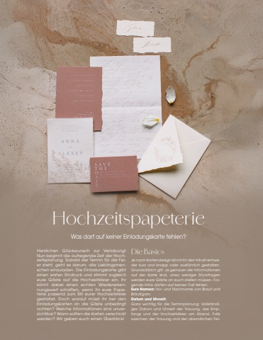 16 | RedaktionHochzeitspapeterieWas darf auf keiner Einladungskarte fehlen?Herzlichen Gl%u00fcckwunsch zur Verlobung! Nun beginnt die aufregende Zeit der Hochzeitsplanung. Sobald der Termin f%u00fcr die Feier steht, geht es darum, alle Lieblingsmenschen einzuladen. Die Einladungskarte gibt einen ersten Eindruck und stimmt zugleich eure G%u00e4ste auf die Hochzeitsfeier ein. Ihr k%u00f6nnt dabei einen echten Wiedererkennungswert schaffen, wenn ihr eure Papeterie passend zum Stil eurer Hochzeitsfeier gestaltet. Doch worauf m%u00fcsst ihr bei den Einladungskarten an die G%u00e4ste unbedingt achten? Welche Informationen sind unverzichtbar? Wann sollten die Karten verschickt werden? Wir geben euch einen %u00dcberblick!Die BasicsJe nach Kartendesign k%u00f6nnt ihr den Inhalt entweder kurz und knapp oder ausf%u00fchrlich gestalten. Grunds%u00e4tzlich gilt: Je genauer die Informationen auf der Karte sind, umso weniger R%u00fcckfragen werden eure G%u00e4ste an euch stellen m%u00fcssen. Folgende Infos d%u00fcrfen auf keinen Fall fehlen.%u00a0Eure Namen: Vor- und Nachname von Braut und Br%u00e4utigam.%u00a0Datum und Uhrzeit:Ganz wichtig f%u00fcr die Terminplanung: Vollst%u00e4ndiges Datum und Uhrzeit der Trauung, des Empfangs und der Hochzeitsfeier am Abend. Falls zwischen der Trauung und der abendlichen Fei-