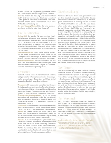 Redaktion | 17er eine %u201eL%u00fccke%u201c im Programm geplant ist, sollten die G%u00e4ste explizit darauf hingewiesen werden.Ort: Wo finden die Trauung und Hochzeitsfeier statt? Und wie kommen die G%u00e4ste zur Location? Gebt genaue Adressen und Namen von Standesamt, Kirche oder Feierlocation sowie eine Anfahrtsbeschreibung an.Art der Trauung/Anlass:Habt ihr eine standesamtliche, kirchliche oder freie Trauung?Die ZusatzinfosAntwortfrist: Ihr werdet f%u00fcr eure weitere Hochzeitsplanung dringend eine genaue G%u00e4steanzahl ben%u00f6tigen. Bis wann wird also um R%u00fcckmeldung gebeten? Eine Frist und vielleicht sogar eine (ausreichend frankierte) R%u00fcckantwortkarteschaffen Verbindlichkeit. Alternativ k%u00f6nnt ihr Zuund Absagen per E-Mail oder WhatsApp entgegennehmen.Geschenkw%u00fcnsche: Lasst eure G%u00e4ste wissen, ob ihr einen Hochzeitstisch plant oder ob ihr Geldgeschenke bevorzugt. In einem Reim oder Spruch l%u00e4sst sich dies ganz charmant verpacken.Ansprechpartner/in: Zus%u00e4tzlich k%u00f6nnt ihr die Namen und Kontaktdaten eurer Trauzeugen oder des Zeremonienmeisters f%u00fcr Fragen zu Geschenken und %u00dcberraschungen angeben.%u00a0%u00a0OptionalJe nach Format k%u00f6nnt ihr nat%u00fcrlich noch weitere obligatorische Informationen in der Einladungskarte unterbringen. Besonders viel Platz bietet dazu eine Booklet- oder Einsteckkarte.Programm: Mit passenden Icons l%u00e4sst sich in eure Einladung eine wundersch%u00f6ne Timeline integrieren, die euren G%u00e4sten einen zeitlichen %u00dcberblick eurer wichtigsten Programmpunkte wie Trauung, Empfang, Gruppenfotos, Dinner und Feier gibt.%u00dcbernachtungsm%u00f6glichkeiten: Habt ihr G%u00e4ste von au%u00dferhalb eingeladen oder die Location ist sehr abgelegen? Dann sind kurze Hinweise auf umliegende Hotels und Reservierungsm%u00f6glichkeiten sehr n%u00fctzlich.Dresscode: Sofern ihr einen bestimmten Kleidungsstil auf eurer Hochzeit w%u00fcnscht, kommuniziert diesen deutlich in der Hochzeitseinladung an eure G%u00e4ste.%u00a0Kinder: Ein heikles Thema, das vorab gekl%u00e4rt sein sollte: Sind Kinder herzlich willkommen, bietet ihr auf eurer Hochzeit eine Kinderbetreuung an oder m%u00f6chtet ihr lieber ohne Nachwuchs feiern?Spruch: Euer Hochzeitsspruch symbolisiert eure Liebe und Ehe und macht sich dementsprechend auch sehr sch%u00f6n in eurer Einladung. Nat%u00fcrlich k%u00f6nnt ihr noch weitaus mehr hineinschreiben. Achtet nur darauf, dass alles %u00fcbersichtlich und verst%u00e4ndlich bleibt. Fasst euch bestenfalls so kurz wie m%u00f6glich, um Verwirrung zu vermeiden.Die GestaltungPasst den Stil eurer Worte der geplanten Feier an. Eine klassisch elegante Hochzeit im Schloss erfordert eine f%u00f6rmliche Ansprache, zu einer legeren Sommerfeier im Freien passt ein lockerer Ton. Vielleicht habt ihr ein Motto f%u00fcr eure Dekoration oder eine gemeinsame Lieblingsfarbe, die nicht fehlen darf?%u00a0Oder ein Foto, das ihr unbedingt verwenden m%u00f6chtet? Was auch immer es sein mag: Eine Hochzeit ist so einzigartig wie das Brautpaar, das sich das Jawort gibt. Und genau diese Individualit%u00e4t sollte sich in euren Einladungskarten widerspiegeln. W%u00e4hlt also ein Motiv, das zu euch und eurer Hochzeitsfeier passt und sich dann wie ein roter Faden durch eure Feier zieht. Das k%u00f6nnt ihr beispielsweise in euren Men%u00fckarten, den Kirchenheften oder sp%u00e4ter in den Dankeskarten verwenden und eure gesamte Deko auf diesen Look abstimmen. Besonders edel und derzeit gefragt sind moderne Kalligraphie und Wachssiegel. Bevor ihr euch endg%u00fcltig f%u00fcr ein Design entscheidet, bestellt am besten eine Auswahl eurer Favoriten als Muster zur Ansicht. So bekommt ihr ein Gef%u00fchl f%u00fcr das Material, die Farben und die Druckqualit%u00e4t.Der DruckLasst eure Einladung vor dem Druck zur Sicherheit noch einmal auf korrekte Rechtschreibung und Grammatik %u00fcberpr%u00fcfen. In der Regel bestellt ihr deutlich weniger Hochzeitseinladungen, als ihr G%u00e4ste erwartet. Schlie%u00dflich bekommen Familien oder Paare meist nur eine Einladung. Trotzdem lohnt es sich, einige Karten mehr zu bestellen und als Reserve aufzubewahren, um noch weitere G%u00e4ste einladen zu k%u00f6nnen, die man bei den ersten Planungen nicht bedacht hat. Ein Exemplar solltet ihr in jedem Fall f%u00fcr euch als Erinnerung aufbewahren!Der VersandWenn ihr vorab Save-the-Date-Karten versendet habt, sollten die Einladungskarten allersp%u00e4testens drei Monate vor der Hochzeit bei euren G%u00e4sten ankommen. Andernfalls ist eine Vorlaufzeit zwischen sechs und acht Monaten empfehlenswert. So bleibt den G%u00e4sten von au%u00dferhalb noch gen%u00fcgend Zeit, um die Anreise zu planen und ein Hotelzimmer zu reservieren.%u00a0Vorfreude ist die sch%u00f6nste Freude:Ab jetzt k%u00f6nnen all eure G%u00e4stemit euch gemeinsam auf euren Hochzeitstag hinfiebern.%u00a0
