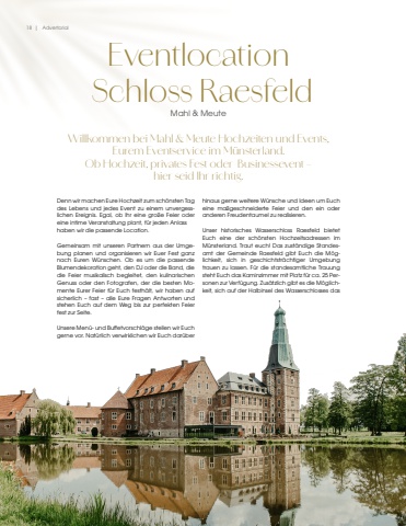 18 | AdvertorialEventlocation Schloss RaesfeldMahl & MeuteWillkommen bei Mahl & Meute Hochzeiten und Events, Eurem Eventservice im M%u00fcnsterland.Ob Hochzeit, privates Fest oder Businessevent %u2013 hier seid Ihr richtig.Denn wir machen Eure Hochzeit zum sch%u00f6nsten Tag des Lebens und jedes Event zu einem unvergesslichen Ereignis. Egal, ob Ihr eine gro%u00dfe Feier oder eine intime Veranstaltung plant, f%u00fcr jeden Anlasshaben wir die passende Location.Gemeinsam mit unseren Partnern aus der Umgebung planen und organisieren wir Euer Fest ganz nach Euren W%u00fcnschen. Ob es um die passende Blumendekoration geht, den DJ oder die Band, diedie Feier musikalisch begleitet, den kulinarischen Genuss oder den Fotografen, der die besten Momente Eurer Feier f%u00fcr Euch festh%u00e4lt, wir haben auf sicherlich %u2013 fast %u2013 alle Eure Fragen Antworten und stehen Euch auf dem Weg bis zur perfekten Feier fest zur Seite.Unsere Men%u00fc- und Buffetvorschl%u00e4ge stellen wir Euch gerne vor. Nat%u00fcrlich verwirklichen wir Euch dar%u00fcber hinaus gerne weitere W%u00fcnsche und Ideen um Euch eine ma%u00dfgeschneiderte Feier und den ein oder anderen Freudentaumel zu realisieren.Unser historisches Wasserschloss Raesfeld bietet Euch eine der sch%u00f6nsten Hochzeitsadressen im M%u00fcnsterland. Traut euch! Das zust%u00e4ndige Standesamt der Gemeinde Raesfeld gibt Euch die M%u00f6glichkeit, sich in geschichtstr%u00e4chtiger Umgebung trauen zu lassen. F%u00fcr die standesamtliche Trauung steht Euch das Kaminzimmer mit Platz f%u00fcr ca. 25 Personen zur Verf%u00fcgung. Zus%u00e4tzlich gibt es die M%u00f6glichkeit, sich auf der Halbinsel des Wasserschlosses das