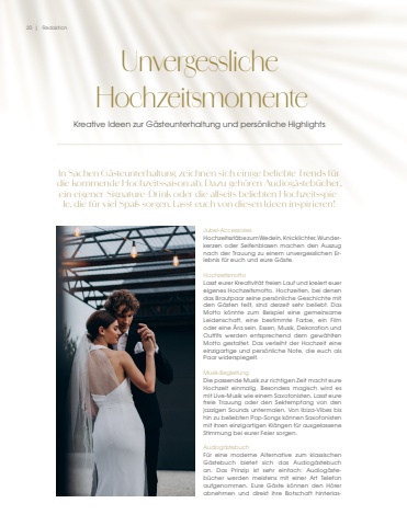 20 | RedaktionUnvergessliche Hochzeitsmomente Kreative Ideen zur G%u00e4steunterhaltung und pers%u00f6nliche HighlightsIn Sachen G%u00e4steunterhaltung zeichnen sich einige beliebte Trends f%u00fcr die kommende Hochzeitssaison ab. Dazu geh%u00f6ren Audiog%u00e4steb%u00fccher, ein eigener Signature-Drink oder die allseits beliebten Hochzeitsspiele, die f%u00fcr viel Spa%u00df sorgen. Lasst euch von diesen Ideen inspirieren!Jubel-AccessoiresHochzeitsst%u00e4be zum Wedeln, Knicklichter, Wunderkerzen oder Seifenblasen machen den Auszug nach der Trauung zu einem unvergesslichen Erlebnis f%u00fcr euch und eure G%u00e4ste.HochzeitsmottoLasst eurer Kreativit%u00e4t freien Lauf und kreiert euer eigenes Hochzeitsmotto. Hochzeiten, bei denen das Brautpaar seine pers%u00f6nliche Geschichte mit den G%u00e4sten teilt, sind derzeit sehr beliebt.%u00a0 Das Motto k%u00f6nnte zum Beispiel eine gemeinsame Leidenschaft, eine bestimmte Farbe, ein Film oder eine %u00c4ra sein. Essen, Musik, Dekoration und Outfits werden entsprechend dem gew%u00e4hlten Motto gestaltet. Das verleiht der Hochzeit eine einzigartige und pers%u00f6nliche Note, die euch als Paar widerspiegelt. Musik-BegleitungDie passende Musik zur richtigen Zeit macht eure Hochzeit einmalig. Besonders magisch wird es mit Live-Musik wie einem Saxofonisten. Lasst eure freie Trauung oder den Sektempfang von den jazzigen Sounds untermalen. Von Ibiza-Vibes bis hin zu beliebten Pop-Songs k%u00f6nnen Saxofonisten mit ihren einzigartigen Kl%u00e4ngen f%u00fcr ausgelassene Stimmung bei eurer Feier sorgen.Audiog%u00e4stebuchF%u00fcr eine moderne Alternative zum klassischen G%u00e4stebuch bietet sich das Audiog%u00e4stebuch an. Das Prinzip ist sehr einfach: Audiog%u00e4steb%u00fccher werden meistens mit einer Art Telefon aufgenommen. Eure G%u00e4ste k%u00f6nnen den H%u00f6rer abnehmen und direkt ihre Botschaft hinterlas-