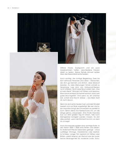26 | RedaktionOffene Haare, Zopfgummi und ein paar Haarklammern helfen, verschiedene Frisuren direkt zu testen. Kleine Details k%u00f6nnen sp%u00e4ter %u00fcber das Gesamtbild entscheiden.Auch wichtig, die richtige Begleitung. Zwei bis f%u00fcnf vertraute Personen sind ideal %u2013 Menschen, die dich gut kennen und ehrlich, aber liebevoll beraten. Zu viele Meinungen f%u00fchren schnell zu Verwirrung. Lass dich von Hollywood-Szenen nicht irritieren. Nicht jede Braut erlebt den %u201eDas ist mein Kleid!%u201c-Moment mit Tr%u00e4nen und Applaus. Manchmal entsteht Sicherheit einfach durch ein gutes Bauchgef%u00fchl. Und wenn du dir unsicher bist, schlaf eine Nacht dr%u00fcber %u2013 das Kleid l%u00e4uft dir nicht davon.Wenn du dich entschieden hast, wird dein Modell bestellt und auf Ma%u00df angefertigt. Bei der n%u00e4chsten Anprobe bringt die Schneiderin es perfekt in Form. Nimm deine Hochzeitsschuhe mit, um die L%u00e4nge genau anzupassen. Eine finale Anprobe kurz vor dem gro%u00dfen Tag ist ratsam, falls noch Kleinigkeiten korrigiert werden m%u00fcssen. So sitzt alles perfekt, wenn der Moment kommt, an dem du Ja sagst.Auch Accessoires spielen eine wichtige Rolle. In der Saison 2025 / 2026 sind Perlen und dezente Statement-Pieces besonders gefragt %u2013 etwa auff%u00e4llige Ohrringe, Haark%u00e4mme oder bestickte Schleier. Langer T%u00fcll, bestickt mit Glitzer oder Bl%u00fcten, erlebt ebenso ein Revival wie der kurze, freche Birdcage-Veil f%u00fcr moderne Looks. Schu-