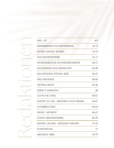 1RedaktionenSAG %u201eJA%u201c 4-9INSPIRIERENDE HOCHZEITSTRENDS 10-13MONEY, MONEY, MONEY%u00a0%u2026 14-15 HOCHZEITSPAPETERIE 16-17UNVERGESSLICHE HOCHZEITSMOMENTE 20-21DAS PERFEKTE HOCHZEITSOUTFIT 24-28DAS WEDDING FESTIVAL 2025 34-37WILD WEDDING 40-42GETTING READY 45-46PERFECT HARMONY 48OUT IN THE OPEN 50-51EUROPE VS. USA - WEDDING FOOD TRENDS 54-57LOVEBIRDS ONLY 60-63MAGIC MOMENT 66-67LOVELY WEDDINGDRINK 68-70NATURE CALLING - WEDDING DREAMS 72-75HONEYMOON 77WEDDING VIBES 78-79