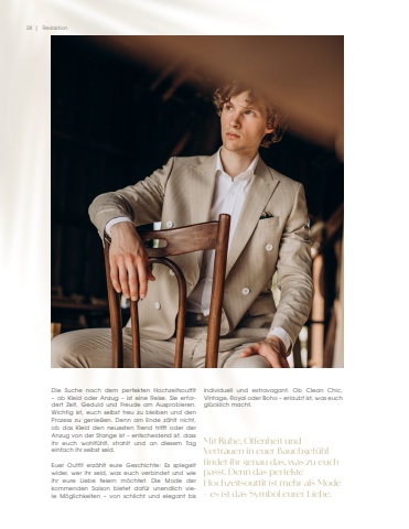 28 | RedaktionDie Suche nach dem perfekten Hochzeitsoutfit %u2013 ob Kleid oder Anzug %u2013 ist eine Reise. Sie erfordert Zeit, Geduld und Freude am Ausprobieren. Wichtig ist, euch selbst treu zu bleiben und den Prozess zu genie%u00dfen. Denn am Ende z%u00e4hlt nicht, ob das Kleid den neuesten Trend trifft oder der Anzug von der Stange ist %u2013 entscheidend ist, dass ihr euch wohlf%u00fchlt, strahlt und an diesem Tag einfach ihr selbst seid.Euer Outfit erz%u00e4hlt eure Geschichte: Es spiegelt wider, wer ihr seid, was euch verbindet und wie ihr eure Liebe feiern m%u00f6chtet. Die Mode der kommenden Saison bietet daf%u00fcr unendlich viele M%u00f6glichkeiten %u2013 von schlicht und elegant bis individuell und extravagant. Ob Clean Chic, Vintage, Royal oder Boho %u2013 erlaubt ist, was euch gl%u00fccklich macht.Mit Ruhe, Offenheit und Vertrauen in euer Bauchgef%u00fchl findet ihr genau das, was zu euch passt. Denn das perfekte Hochzeitsoutfit ist mehr als Mode %u2013 es ist das Symbol eurer Liebe.