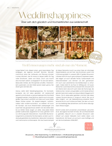 32 | AdvertorialWeddinghappiness%u00dcber Leih dich gl%u00fccklich und Hochzeitstorten aus Leidenschaft.Showroom - Alter Kasernenring 14, 46325 Borken | info@weddinghappiness.de@weddinghappiness2022 | www.weddinghappiness.deWeil Erinnerungen mehr sind als nur ein Moment.Lange fiebert man diesem einen, ganz besonderen Tag entgegen, der eigenen Hochzeit. Wochen, Monate, manchmal Jahre der Vorfreude und Planung m%u00fcnden in einen Moment, der f%u00fcr immer im Herzen bleibt. Ein Tag voller Emotionen, Liebe und Gl%u00fcck. Doch was macht eine Hochzeit wirklich unvergesslich? Es sind die kleinen, liebevollen Details, die Atmosph%u00e4re schaffen, Pers%u00f6nlichkeit ausdr%u00fccken und die G%u00e4ste sp%u00fcren lassen genau hier steckt ganz viel Herz drin. Genau daf%u00fcr steht Weddinghappiness. F%u00fcr Hochzeitskonzepte, die mit Liebe gestaltet, mit Leidenschaft geplant und mit einem unverwechselbaren Sinn f%u00fcrs Detail umgesetzt werden. Unser Ziel ist es, dass ihr euch an eurem gro%u00dfen Tag rundum wohlf%u00fchlt und dass auch eure G%u00e4ste diesen Zauber sp%u00fcren. Ob klassisch-elegant, nat%u00fcrlichrustikal oder modern-romantisch, wir kreieren mit euch ein Konzept, das eure Pers%u00f6nlichkeit widerspiegelt und eurer Feier das gewisse Etwas verleiht. Von der ersten Idee bis zur letzten Kerze sorgen wir daf%u00fcr, dass jedes Detail perfekt aufeinander abgestimmt ist. Dazu geh%u00f6ren nicht nur stimmungsvolle Dekorationen, traumhafte Blumenarrangements und kreative Tischkonzepte, sondern auch individuell gestaltete Hochzeitstorten, liebevolle Candybars und harmonische Lichtkonzepte. Erst das Zusammenspiel all dieser Elemente macht aus einer Feier ein stimmiges Gesamterlebnis und ein Fest, das Emotionen weckt und in Erinnerung bleibt. In unserem 200 m%u00b2 gro%u00dfen Showroom in Borken k%u00f6nnt ihr euch ganz entspannt inspirieren lassen. Hier zeigen wir euch aktuelle Trends, Farbkonzepte und Dekorationsideen und nehmen uns Zeit, gemeinsammit euch euer pers%u00f6nliches Hochzeitskonzept zu entwickeln. Dabei steht ihr als Paar im Mittelpunkt, mit eurenW%u00fcnschen, eurer Geschichte und eurem Stil. Und wenn sich am Abend dann das Licht warm %u00fcber die Tische legt, die G%u00e4ste lachen, tanzen und genie%u00dfen und ihr beide einfach gl%u00fccklich seid, dann wissen wir, dass wir alles richtig gemacht haben. Ob ihr vieles selbst gestalten m%u00f6chtet oder lieber unseren Rundum-Service in Anspruch nehmt: Bei uns ist alles m%u00f6glich, von der Selbstabholung einzelner Dekolemente bis hin zum Full-Service-Paket, bei dem wir euch am Hochzeitstag alles abnehmen und f%u00fcr einen reibungslosen Ablauf sorgen.Kommt vorbei, lernt uns kennen und entdeckt, wie sch%u00f6n es ist, die eigene Hochzeit mit Herz, Stil und Pers%u00f6nlichkeit zu gestalten. Besucht uns in unserem Showroom oder st%u00f6bert auf unserer Webseite nach ersten Ideen und Inspirationen. Wir freuen uns auf euch, eure Auftr%u00e4ge und auf die Hochzeitsaison 2026/2027.Fotos Capture Life Photografie, Blumen Blumen Knecht, Papeterie Dreativ Design, Location Alte Schlossfabrik, St%u00fchle Event Rent, Pre-Event Weddingkingawards.Website