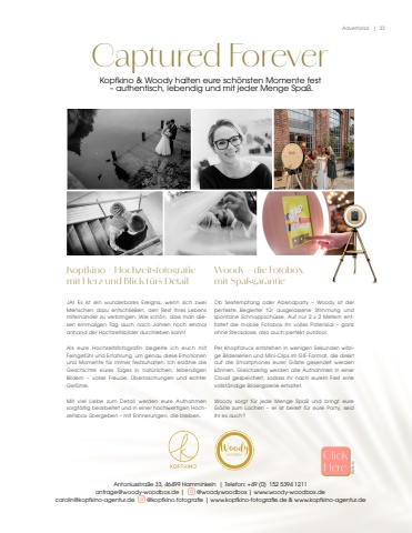Advertorial | 33Antoniusstra%u00dfe 33, 46499 Hamminkeln | Telefon: +49 (0) 152 5394 1211anfrage@woody-woodbox.de | @woodywoodbox | www.woody-woodbox.de carolin@kopfkino-agentur.de @kopfkino.fotografie | www.kopfkino-fotografie.de & www.kopfkino-agentur.deKopfkino %u2013 Hochzeitsfotografie mit Herz und Blick f%u00fcrs DetailJA! Es ist ein wunderbares Ereignis, wenn sich zwei Menschen dazu entschlie%u00dfen, den Rest ihres Lebens miteinander zu verbringen. Wie sch%u00f6n, dass man diesen einmaligen Tag auch nach Jahren noch einmal anhand der Hochzeitsbilder durchleben kann!Als eure Hochzeitsfotografin begleite ich euch mit Feingef%u00fchl und Erfahrung, um genau diese Emotionen und Momente f%u00fcr immer festzuhalten. Ich erz%u00e4hle die Geschichte eures Tages in nat%u00fcrlichen, lebendigen Bildern %u2013 voller Freude, %u00dcberraschungen und echter Gef%u00fchle.Mit viel Liebe zum Detail werden eure Aufnahmen sorgf%u00e4ltig bearbeitet und in einer hochwertigen Hochzeitsbox %u00fcbergeben %u2013 mit Erinnerungen, die bleiben.Woody %u2013 die Fotoboxmit Spa%u00dfgarantieOb Sektempfang oder Abendparty %u2013 Woody ist der perfekte Begleiter f%u00fcr ausgelassene Stimmung und spontane Schnappsch%u00fcsse. Auf nur 2 x 2 Metern entfaltet die mobile Fotobox ihr volles Potenzial %u2013 ganz ohne Steckdose, also auch perfekt outdoor.Per Knopfdruck entstehen in wenigen Sekunden witzige Bilderserien und Mini-Clips im GIF-Format, die direkt auf die Smartphones eurer G%u00e4ste gesendet werden k%u00f6nnen. Gleichzeitig werden alle Aufnahmen in einer Cloud gespeichert, sodass ihr nach eurem Fest eine vollst%u00e4ndige Bildergalerie erhaltet.Woody sorgt f%u00fcr jede Menge Spa%u00df und bringt eure G%u00e4ste zum Lachen %u2013 er ist bereit f%u00fcr eure Party, seid ihr es auch?Captured ForeverKopfkino & Woody halten eure sch%u00f6nsten Momente fest %u2013 authentisch, lebendig und mit jeder Menge Spa%u00df.Website