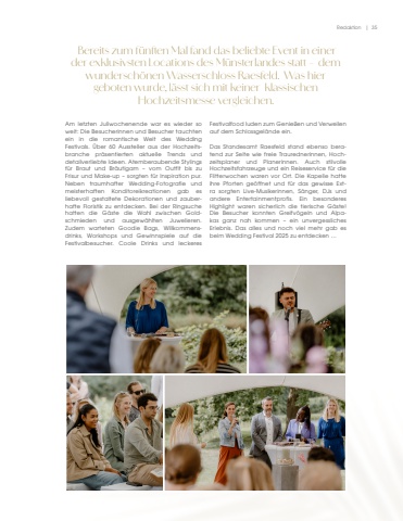 Redaktion | 35 Bereits zum f%u00fcnften Mal fand das beliebte Event in einer der exklusivsten Locations des M%u00fcnsterlandes statt %u2013 dem wundersch%u00f6nen Wasserschloss Raesfeld. Was hier geboten wurde, l%u00e4sst sich mit keiner klassischenHochzeitsmesse vergleichen.Am letzten Juliwochenende war es wieder so weit: Die Besucherinnen und Besucher tauchtenein in die romantische Welt des Wedding Festivals. %u00dcber 60 Aussteller aus der Hochzeitsbranche pr%u00e4sentierten aktuelle Trends und detailverliebte Ideen. Atemberaubende Stylings f%u00fcr Braut und Br%u00e4utigam %u2013 vom Outfit bis zu Frisur und Make-up %u2013 sorgten f%u00fcr Inspiration pur. Neben traumhafter Wedding-Fotografie und meisterhaften Konditoreikreationen gab es liebevoll gestaltete Dekorationen und zauberhafte Floristik zu entdecken. Bei der Ringsuche hatten die G%u00e4ste die Wahl zwischen Goldschmieden und ausgew%u00e4hlten Juwelieren. Zudem warteten Goodie Bags, Willkommensdrinks, Workshops und Gewinnspiele auf die Festivalbesucher. Coole Drinks und leckeres Festivalfood luden zum Genie%u00dfen und Verweilen auf dem Schlossgel%u00e4nde ein.Das Standesamt Raesfeld stand ebenso beratend zur Seite wie freie Traurednerinnen, Hochzeitsplaner und Planerinnen. Auch stilvolle Hochzeitsfahrzeuge und ein Reiseservice f%u00fcr die Flitterwochen waren vor Ort. Die Kapelle hatte ihre Pforten ge%u00f6ffnet und f%u00fcr das gewisse Extra sorgten Live-Musikerinnen, S%u00e4nger, DJs undandere Entertainmentprofis. Ein besonderes Highlight waren sicherlich die tierische G%u00e4ste! Die Besucher konnten Greifv%u00f6geln und Alpakas ganz nah kommen %u2013 ein unvergessliches Erlebnis. Das alles und noch viel mehr gab es beim Wedding Festival 2025 zu entdecken %u2026