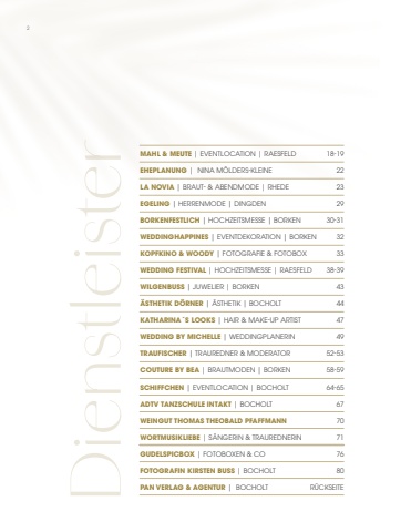 2DienstleisterMAHL & MEUTE | EVENTLOCATION | RAESFELD 18-19EHEPLANUNG | NINA M%u00d6LDERS-KLEINE 22LA NOVIA | BRAUT- & ABENDMODE | RHEDE 23EGELING | HERRENMODE | DINGDEN 29 BORKENFESTLICH | HOCHZEITSMESSE | BORKEN 30-31WEDDINGHAPPINES | EVENTDEKORATION | BORKEN 32KOPFKINO & WOODY | FOTOGRAFIE & FOTOBOX 33WEDDING FESTIVAL | HOCHZEITSMESSE | RAESFELD 38-39WILGENBUSS | JUWELIER | BORKEN 43%u00c4STHETIK D%u00d6RNER | %u00c4STHETIK | BOCHOLT 44KATHARINA%u00b4S LOOKS | HAIR & MAKE-UP ARTIST 47WEDDING BY MICHELLE | WEDDINGPLANERIN 49TRAUFISCHER | TRAUREDNER & MODERATOR 52-53COUTURE BY BEA | BRAUTMODEN | BORKEN 58-59SCHIFFCHEN | EVENTLOCATION | BOCHOLT 64-65ADTV TANZSCHULE INTAKT | BOCHOLT 67WEINGUT THOMAS THEOBALD PFAFFMANN 70WORTMUSIKLIEBE | S%u00c4NGERIN & TRAUREDNERIN 71GUDELSPICBOX | FOTOBOXEN & CO 76FOTOGRAFIN KIRSTEN BUSS | BOCHOLT 80PAN VERLAG & AGENTUR | BOCHOLT R%u00dcCKSEITE