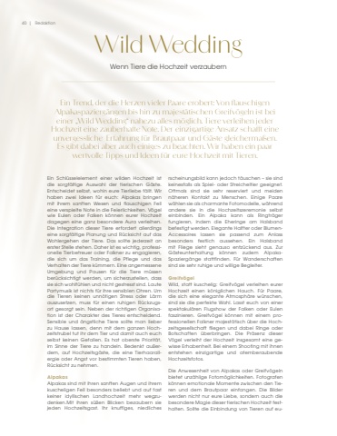 40 | RedaktionWild WeddingWenn Tiere die Hochzeit verzaubernEin Trend, der die Herzen vieler Paare erobert: Von flauschigen Alpakaspazierg%u00e4ngen bis hin zu majest%u00e4tischen Greifv%u00f6geln ist bei einer %u201eWild Wedding%u201c nahezu alles m%u00f6glich. Tiere verleihen jeder Hochzeit eine zauberhafte Note. Der einzigartige Ansatz schafft eine unvergessliche Erfahrung f%u00fcr Brautpaar und G%u00e4ste gleicherma%u00dfen. Es gibt dabei aber auch einiges zu beachten. Wir haben ein paar wertvolle Tipps und Ideen f%u00fcr eure Hochzeit mit Tieren. rscheinungsbild kann jedoch t%u00e4uschen %u2013 sie sind keinesfalls als Spiel- oder Streicheltier geeignet.Oftmals sind sie sehr reserviert und meiden n%u00e4heren Kontakt zu Menschen. Einige Paare w%u00e4hlen sie als charmante Fotomodelle, w%u00e4hrendandere sie in die Hochzeitszeremonie selbst einbinden. Ein Alpaka kann als Ringtr%u00e4ger fungieren, indem die Eheringe am Halsband befestigt werden. Elegante Halfter oder BlumenAccessoires lassen sie passend zum Anlass besonders festlich aussehen. Ein Halsband mit Fliege sieht genauso entz%u00fcckend aus. Zur G%u00e4steunterhaltung k%u00f6nnen zudem AlpakaSpazierg%u00e4nge stattfinden. F%u00fcr Wanderschaften sind sie sehr ruhige und willige Begleiter.%u00a0Greifv%u00f6gelWild, statt kuschelig: Greifv%u00f6gel verleihen eurer Hochzeit einen k%u00f6niglichen Hauch. F%u00fcr Paare, die sich eine elegante Atmosph%u00e4re w%u00fcnschen, sind sie die perfekte Wahl. Lasst euch von einer spektakul%u00e4ren Flugshow der Falken oder Eulen faszinieren. Greifv%u00f6gel k%u00f6nnen mit einem professionellen Falkner majest%u00e4tisch %u00fcber die Hochzeitsgesellschaft fliegen und dabei Ringe oder Botschaften %u00fcberbringen. Die Pr%u00e4senz dieser V%u00f6gel verleiht der Hochzeit insgesamt eine gewisse Erhabenheit. Bei einem Shooting mit ihnen entstehen einzigartige und atemberaubende Hochzeitsfotos.Die Anwesenheit von Alpakas oder Greifv%u00f6geln bietet unz%u00e4hlige Fotom%u00f6glichkeiten. Fotografen k%u00f6nnen emotionale Momente zwischen den Tieren und dem Brautpaar einfangen. Die Bilder werden nicht nur eure Liebe, sondern auch die besondere Magie dieser tierischen Hochzeit festhalten. Sollte die Einbindung von Tieren auf euEin Schl%u00fcsselelement einer wilden Hochzeit ist die sorgf%u00e4ltige Auswahl der tierischen G%u00e4ste. Entscheidet selbst, wohin eure Tierliebe f%u00e4llt. Wir haben zwei Ideen f%u00fcr euch: Alpakas bringen mit ihrem sanften Wesen und flauschigen Fell eine verspielte Note in die Feierlichkeiten. V%u00f6gelwie Eulen oder Falken k%u00f6nnen eurer Hochzeit dagegen eine ganz besondere Aura verleihen. Die Integration dieser Tiere erfordert allerdings eine sorgf%u00e4ltige Planung und R%u00fccksicht auf das Wohlergehen der Tiere. Das sollte jederzeit an erster Stelle stehen. Daher ist es wichtig, professionelle Tierbetreuer oder Falkner zu engagieren,die sich um das Training, die Pflege und das Verhalten der Tiere k%u00fcmmern. Eine angemesseneUmgebung und Pausen f%u00fcr die Tiere m%u00fcssen ber%u00fccksichtigt werden, um sicherzustellen, dass sie sich wohlf%u00fchlen und nicht gestresst sind. LautePartymusik ist nichts f%u00fcr ihre sensiblen Ohren. Um die Tieren keinen unn%u00f6tigen Stress oder L%u00e4rm auszusetzen, muss f%u00fcr einen ruhigen R%u00fcckzugsort gesorgt sein. Neben der richtigen Organisation ist der Charakter des Tieres entscheidend. Sensible und %u00e4ngstliche Tiere sollte man lieber zu Hause lassen, denn mit dem ganzen Hochzeitstrubel tut ihr dem Tier und damit auch euch selbst keinen Gefallen. Es hat oberste Priorit%u00e4t, im Sinne der Tiere zu handeln. Bedenkt au%u00dferdem, auf Hochzeitsg%u00e4ste, die eine Tierhaarallergie oder Angst vor bestimmten Tieren haben, R%u00fccksicht zu nehmen.Alpakas%u00a0Alpakas sind mit ihren sanften Augen und ihrem kuscheligen Fell besonders beliebt und auf fast keiner idyllischen Landhochzeit mehr wegzudenken.Mit ihren s%u00fc%u00dfen Blicken bezaubern sie jeden Hochzeitsgast. Ihr knuffiges, niedliches