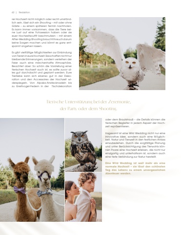 42 | Redaktionrer Hochzeit nicht m%u00f6glich oder recht umst%u00e4ndlich sein, l%u00e4sst sich ein Shooting %u2013 mit oder ohne G%u00e4ste %u2013 zu einem sp%u00e4teren Termin nachholen. Es kann immer vorkommen, dass die Tiere keine Lust auf eine Fotosession haben oder sie euer Hochzeitsoutfit beschmutzen %u2013 mit einem After-Wedding-Shooting braucht ihr euch darum keine Sorgen machen und k%u00f6nnt es ganz entspannt angehen lassen.%u00a0Es gibt vielf%u00e4ltige M%u00f6glichkeiten zur Einbindung von Tieren in eure Hochzeit. Sie schaffen nicht nur bleibende Erinnerungen, sondern verleihen der Feier auch eine m%u00e4rchenhafte Atmosph%u00e4re. Beachtet aber: So sch%u00f6n die Vorstellung einer tierischen Hochzeit auch ist, es sollte zuvor alles gut durchdacht und geplant werden. Eure Tierliebe kann sich ebenso gut in der Dekoration und den Accessoires der Hochzeit widerspiegeln. Von Alpaka-Anstecknadeln bis zu Greifvogel-Federn in der Tischdekoration Tierische Unterst%u00fctzung bei der Zeremonie, der Party oder dem Shooting.oder dem Brautstrau%u00df %u2013 die Details k%u00f6nnen die tierischen Begleiter in jedem Aspekt der Hochzeit repr%u00e4sentieren. Insgesamt ist eine Wild Wedding nicht nur eine innovative Idee, sondern auch eine M%u00f6glichkeit, Natur und Tierwelt in den festlichen Anlass einzubeziehen. Durch die sorgf%u00e4ltige Planung und unter Ber%u00fccksichtigung des Tierwohls k%u00f6nnen Paare eine Hochzeit erleben, die nicht nur einzigartig und unterhaltsam ist, sondern auch eine tiefe Verbindung zur Natur herstellt. Eine Wild Wedding ist weit mehr als eine normale Hochzeit %u2013 sie l%u00e4sst den sch%u00f6nsten Tag des Lebens zu einem unvergesslichen Abenteuer werden.