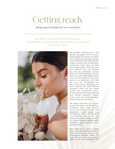 Redaktion | 45Jede Braut strahlt an ihrem Hochzeitstag %u2013und mit dem richtigen Make-up und einer besonderenFrisur noch mehr. Getting ready Bringt euer sch%u00f6nstes Ich zum Leuchten!Die perfekte Vorbereitung f%u00fcr den gro%u00dfen Tag beginnt weit im Voraus. Regelm%u00e4%u00dfige Treatments und effektive Gesichtsbehandlungen erzielen einen makellosen Teint. Beautykuren sorgen f%u00fcr einen lang anhaltenden, strahlenden Glow. Eine bewussteund ausgewogene Ern%u00e4hrung wirkt sich nat%u00fcrlich auf das Hautbild aus. F%u00fcr ein strahlendes L%u00e4cheln helfen eine Zahnreinigung oder ein Bleaching. Mit regelm%u00e4%u00dfigen Haarkuren und %u00d6len pflegt ihr euer Haar gesund und gl%u00e4nzend. Zur Probe wie auch am Hochzeitstag solltet ihr eure Haare allerdings nicht frisch waschen und keine Sp%u00fclung benutzen, damit sie sich besser formen und hochstecken lassen. Ein dramatischer Wimpernaufschlag und perfekt geformte Augenbrauen sind zum ausdrucksstarken Beauty-Statement avanciert. Mit einem B%u00fcrstchen und Augenbrauen-Gel lassen sich die H%u00e4rchen wunderbar nach oben k%u00e4mmen und in Form bringen Ein Lash- und Browlifting erzielt einen lang anhaltenden Effekt. Mit Manik%u00fcreund Pedik%u00fcre sorgt ihr f%u00fcr den letzten Feinschliff. Gepflegte H%u00e4nde und perfekt lackierte N%u00e4gel haben sp%u00e4testens beim Ringtausch ihren gro%u00dfen Auftritt.Beim Make-up ist auch in dieser Saison weniger meist mehr! Der No Make-up-Glow r%u00fcckt weiter in den Vordergrund. Klassisch, zeitlos und sch%u00f6n ist der zarte Nude-Lookmit sanften Erd- und Roset%u00f6nen, der