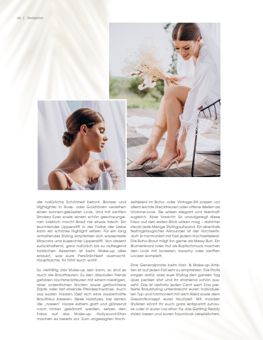 46 | Redaktiondie nat%u00fcrliche Sch%u00f6nheit betont. Bronzer undHighlighter in Rose- oder Goldt%u00f6nen verleihen einen sonnen-gek%u00fcssten Look. Und mit sanften Smokey Eyes sowie einem sch%u00f6n geschwungenen Lidstrich macht Braut nie etwas falsch. Ein leuchtender Lippenstift in der Farbe der Liebe kann ein sch%u00f6nes Highlight setzen. F%u00fcr ein lang anhaltendes Styling empfehlen sich wasserfeste Mascara und kussechter Lippenstift. Von dezent zur%u00fcckhaltend, ganz nat%u00fcrlich bis zu aufregend farblichen Akzenten ist beim Make-up alles erlaubt, was eure Pers%u00f6nlichkeit ausmacht. Hauptsache, ihr f%u00fchlt euch wohl! So vielf%u00e4ltig das Make-up sein kann, so sind es auch die Brautfrisuren. Zu den absoluten Trends geh%u00f6ren Hochsteckfrisuren mit einem niedrigen, aber ordentlichen Knoten sowie geflochtene Z%u00f6pfe oder tief sitzende Pferdeschw%u00e4nze. Auch aus kurzen Haaren l%u00e4sst sich eine zauberhafte Brautfrisur kreieren. Sleek Hairstyles, bei denen die %u201enassen%u201c Haare extrem glatt und gl%u00e4nzend nach hinten gek%u00e4mmt werden, setzen den Fokus auf das Make-up. Hollywood-Starsmachen es bereits vor. Zum angesagten Hochzeitskleid im Boho- oder Vintage-Stil passen vor allem leichte Steckfrisuren oder offene Wellen als Undone-Look. Sie wirken elegant und feenhaft zugleich. Aber Vorsicht: So unaufgeregt diese Frisur auf den ersten Blick wirken mag %u2013 dahinter steckt jede Menge Stylingaufwand. Ein ebenfalls festtagstauglicher Allrounder ist der Hochzeitsdutt. Er harmoniert mit fast jedem Hochzeitskleid. Die Boho-Braut tr%u00e4gt ihn gerne als Messy Bun. Ein Blumenkranz oder Hut als Kopfschmuck machen den Look mit lockeren, beachy oder sanftenLocken komplett. Eine Generalprobe beim Hair- & Make-up-Artisten ist auf jeden Fall sehr zu empfehlen. Die Profis sorgen daf%u00fcr, dass euer Styling den ganzen Tag %u00fcber perfekt sitzt und ihr strahlend sch%u00f6n ausseht. Das ist definitiv jeden Cent wert. Das perfekte Brautstyling unterstreicht euren individuellen Typ und harmoniert mit dem Kleid sowie demGesamtkonzept eurer Hochzeit. Mit mobilen Stylisten k%u00f6nnt ihr euch ganz entspannt zuhause oder in eurer Location f%u00fcr das Getting Ready stylen lassen und euren Traumlook verwirklichen.