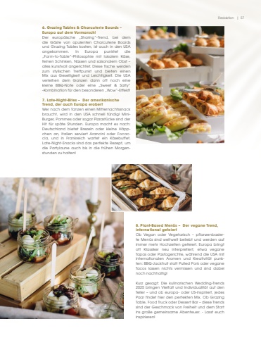 Redaktion | 576. Grazing Tables & Charcuterie Boards %u2013 Europa auf dem Vormarsch!Der europ%u00e4ische %u201eSharing%u201c-Trend, bei dem die G%u00e4ste von opulenten Charcuterie Boards und Grazing Tables kosten, ist auch in den USA angekommen. In Europa punktet die %u201eFarm-to-Table%u201c-Philosophie mit lokalem K%u00e4se, feinen Schinken, N%u00fcssen und saisonalem Obst %u2013 alles kunstvoll angerichtet. Diese Tische werdenzum stylischen Treffpunkt und bieten einen Mix aus Geselligkeit und Leichtigkeit. Die USA verleihen dem Ganzen dann oft noch eine kleine BBQ-Note oder eine %u201eSweet & Salty%u201c -Kombination f%u00fcr den besonderen %u201eWow%u201c-Effekt!7. Late-Night-Bites %u2013 Der amerikanische Trend, der auch Europa erobertWer nach dem Tanzen einen Mitternachtssnack braucht, wird in den USA schnell f%u00fcndig! MiniBurger, Pommes oder sogar Pizzast%u00fccke sind der Hit f%u00fcr sp%u00e4te Stunden. Europa macht es nach: Deutschland bietet Brezeln oder kleine H%u00e4ppchen an, Italien serviert Arancini oder Focaccia, und in Frankreich wartet ein K%u00e4sebuffet. Late-Night-Snacks sind das perfekte Rezept, um die Partylaune auch bis in die fr%u00fchen Morgenstunden zu halten!8. Plant-Based Men%u00fcs %u2013 Der vegane Trend, international gefeiertOb Vegan oder Vegetarisch %u2013 pflanzenbasierte Men%u00fcs sind weltweit beliebt und werden auf immer mehr Hochzeiten gefeiert. Europa bringt oft Klassiker neu interpretiert, etwa veganeTapas oder Pastagerichte, w%u00e4hrend die USA mit internationalen Aromen und Kreativit%u00e4t punkten: BBQ-Jackfruit statt Pulled Pork oder veganeTacos lassen nichts vermissen und sind dabei noch nachhaltig!Kurz gesagt: Die kulinarischen Wedding-Trends 2025 bringen Vielfalt und Individualit%u00e4t auf den Teller %u2013 und ob europa- oder US-inspiriert, jedes Paar findet hier den perfekten Mix. Ob Grazing Table, Food Truck oder Dessert Bar %u2013 diese Trends sind der Geschmack von Freiheit und dem Start ins gro%u00dfe gemeinsame Abenteuer. - Lasst euch inspirieren!