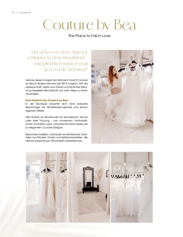 58 | AdvertorialCouture by BeaThe Place to Fall in LoveDu stehst vor dem Spiegel, schl%u00fcpfst in dein Brautkleid %u2013 und pl%u00f6tzlich wird es real:%u201eIch werde heiraten!%u201cGenau diesen magischen Moment macht Couture by Bea in Borken-Gemen seit 2015 m%u00f6glich. Mit viel Leidenschaft, Liebe zum Detail und ehrlicher Beratung begleitet Bea Br%u00e4ute auf dem Weg zu ihrem Traumkleid.Dein Erlebnis bei Couture by BeaIn der Boutique erwartet dich eine exklusive Braut-Etage mit Wohlf%u00fchlatmosph%u00e4re und einem eigenen Atelier.Hier findest du Brautmode f%u00fcr Standesamt, Kirche oder freie Trauung %u2013 von modernen, minimalistischen Schnitten %u00fcber romantische Boho-Styles bis zu eleganten Couture-Designs.Besonders beliebt: individuell kombinierbare Zweiteiler aus R%u00f6cken, Hosen und Spitzenoberteilen, die deinen pers%u00f6nlichen Stil perfekt unterstreichen.