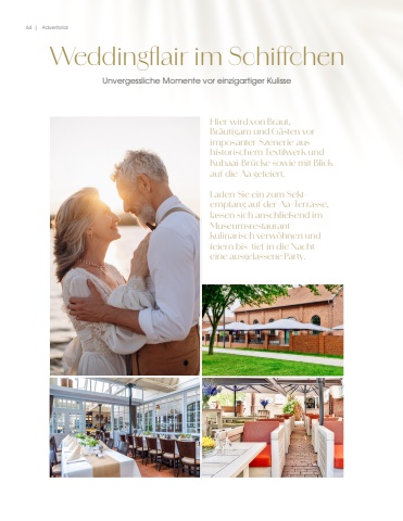 64 | AdvertorialWeddingflair im SchiffchenUnvergessliche Momente vor einzigartiger KulisseHier wird von Braut, Br%u00e4utigam und G%u00e4sten vorimposanter Szenerie aus historischem Textilwerk und Kubaai-Br%u00fccke sowie mit Blick auf die Aa gefeiert.Laden Sie ein zum Sektempfang auf der Aa-Terrasse,lassen sich anschlie%u00dfend im Museumsrestaurant kulinarisch verw%u00f6hnen und feiern bis tief in die Nachteine ausgelassene Party.