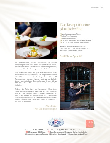 Advertorial | 65Uhlandstra%u00dfe 50, 46397 Bocholt | Telefon: +49 (0) 2871 7508 | info@katrin-elsmann.de@Restaurant Schiffchen | @schiffchenbocholt | www.schiffchen-bocholt.de%u00d6ffnungszeiten: Montag: Ruhetag | Dienstag %u2013 Sonntag ab 11 Uhr durchgehend ge%u00f6ffnet!Bei erstklassigem Service verw%u00f6hnen Sie Ronald Boterkooper und sein Team des Schiffchens kulinarisch mit einem f%u00fcr Sie individuell zusammengestellten, exklusiven Men%u00fc oder ausgesuchten Buffet.Das Restaurant bietet mit gem%u00fctlichem Blick ins Textilmuseum bis zu 120 Sitzpl%u00e4tze, ein abgetrennter Raum bietet f%u00fcr eine kleinere Hochzeitsgesellschaft bis zu 50 Personen den idealen Rahmen und auf der beheizbaren spektakul%u00e4ren Sommerterrasse finden bis zu200 G%u00e4ste Platz. Blick auf die Aa selbstverst%u00e4ndlichinklusive. Neben der Feier kann im Historischen Maschinenhaus des Textilmuseums auch das JA-Wort zelebriert werden. Der Sektempfang im direkt angrenzenden Biergarten bietet ein einzigartiges und besonderes Flair. In der Regel ist eine Trauung jeden 3. Freitag im Monat m%u00f6glich. Die Zeiten sind beim Standesamt in Bocholt zu erfragen.Alles Gute, Ronald Boterkooper Das Rezept f%u00fcr eine gl%u00fcckliche Ehe zwei passgenaue Ringe eine Prise Ausdauer 500g Leidenschaft Je 300g Vertrauen, Ehrlichkeit & Treue Je 2 EL Humor, Spa%u00df & Verst%u00e4ndnisZutaten unter st%u00e4ndigem R%u00fchren St%u00fcck f%u00fcr St%u00fcck zusammenf%u00fcgen undein paar Jahre ziehen lassen. Voil%u00e0! Bon Appetit! Website