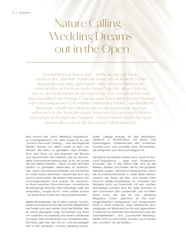 72 | RedaktionHochzeiten auf dem Land %u2013 mehr als nur ein Trend, sondern der absolute Traum f%u00fcr Paare, die sich nach echter Romantik und einer %u201elaid-back%u201c- Vibe sehnen. Mittlerweile entscheiden sich immer mehr junge Paare f%u00fcr dieses Setting, das so viel mehr bietet als die klassische City-Location. Ob eine %u201ebarn wedding%u201c mit Vintage-Charme, eine Feier unter freiem Himmel oder ein entspanntes Fest inmitten bl%u00fchender Felder %u2013 das l%u00e4ndliche Ambiente schafft ein Erlebnis, das so einzigartig wie das Paar selbst ist. F%u00fcr die Traumhochzeit zwischen Wiesen und W%u00e4ldern muss man nicht mehr ins Ausland %u2013 Deutschlands l%u00e4ndliche Spots haben alles, was es f%u00fcr den %u201ewow%u201c-Effekt braucht!Nature Calling - Wedding Dreams out in the OpenWas macht die %u201eFarm Wedding Experience%u201c so unwiderstehlich? F%u00fcr viele Paare ist es das %u201eback-to-the-roots%u201c-Feeling %u2013 das beruhigendeGef%u00fchl, fernab von allem Trubel zu sein und einfach die Natur zu genie%u00dfen. Kein Stra%u00dfenl%u00e4rm, kein Rush, nur das Rascheln der B%u00e4ume und das Summen der Insekten, das f%u00fcr das perfekte Summertime-Feeling sorgt. Es ist, als w%u00fcrde die Zeit stehen bleiben %u2013 ideal, um den Moment wirklich zu genie%u00dfen. Besonders im Sp%u00e4tsommer, wenn Sonnenblumenfelder und Kornfelder im vollen Glanz erstrahlen, verwandelt sich das Land in eine Kulisse, die keinem Filter bedarf. Die Fotom%u00f6glichkeiten sind endlos: Ob vertr%u00e4umte Shots zwischen Sonnenblumen, romantische Spazierg%u00e4nge entlang alter Feldwege oder ein verspieltes %u201ecouple shoot%u201c unter uralten Eichen %u2013 f%u00fcr jedes Paar findet sich die perfekte Kulisse.Wei%u00dfe Bridalkleider, die im Wind wehen, harmonieren wundersch%u00f6n mit den sanften Beiget%u00f6nen der Felder und dem satten Gr%u00fcn der W%u00e4lder. Wer es etwas gewagter mag, kombiniert das Kleid mit rustikalen Accessoires wie einem wildflower bouquet oder Haarkr%u00e4nzen aus Trockenblumen. Die Natur gibt hier den Ton an, und das spiegelt sich in den aktuellen %u201ecountry wedding trends%u201c wider. L%u00e4ssige Anz%u00fcge f%u00fcr den Br%u00e4utigam, vielleicht in Kombination mit Boots und Hosentr%u00e4gern, unterstreichen den modernenCountry-Look und schaffen eine Atmosph%u00e4re, die entspannt und dennoch elegant ist. L%u00e4ndliche Hochzeiten bieten eine %u201eback-to-theroots%u201c-Experience %u2013 weg vom Gro%u00dfstadtdschungel, rein in die Natur! Hier sind es die Wiesen, W%u00e4lder und Felder, die f%u00fcr die perfekteSzenerie sorgen. Gerade im Sp%u00e4tsommer, wenn die Sonnenblumenfelder in voller Bl%u00fcte stehen, zaubert die Natur ein Bild, das keinen Filter braucht. Wei%u00dfe Brautkleider ha monieren hier %u00fcbrigens nicht nur traumhaft mit den sanften Naturbeige sondern sind ein toller Kontrast zu den Gr%u00fcnt%u00f6nen der Landschaft und schaffeneinen Look, der wie f%u00fcr das %u201eWeddingMagazine Cover%u201c gemacht ist. Die Fotom%u00f6glichkeiten? Unbegrenzt! Von entspanntenShots in einer Scheune, %u00fcber vertr%u00e4umte Spazierg%u00e4nge am Waldrand bis hin zum legend%u00e4ren Couple-Shoot zwischen Sonnenblumen oder gar Lavendelfeldern %u2013 das %u201eCountryside Wedding%u201c bietet nicht nur Romantik, sondern auch endlos viel %u201eContent%u201c f%u00fcr die Gallery.