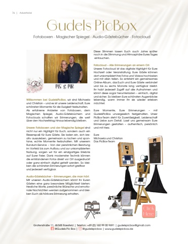 76 | AdvertorialGudels PicBoxFotoboxen %u00b7 Magischer Spiegel %u00b7 Audio-G%u00e4steb%u00fccher %u00b7 FotocloudWillkommen bei GudelsPicBox, wir sind Michaela und Christian %u2013 und es ist unsere Leidenschaft, Eure sch%u00f6nsten Momente f%u00fcr die Ewigkeit festzuhalten.Als erfahrene Anbieter von Fotoboxen, dem Magischen Spiegel, Audio-G%u00e4steb%u00fcchern und Fotoclouds schaffen wir Erinnerungen, die weit%u00fcber den Hochzeitstag hinaus lebendig bleiben.Unsere Fotoboxen und der Magische Spiegel sind nicht nur ein Highlight f%u00fcr Euch, sondern auch ein Riesenspa%u00df f%u00fcr Eure G%u00e4ste. Sie laden ein, sich kreativ auszuleben, gemeinsam zu lachen und spontane, echte Momente festzuhalten. Mit unserem Rundum-Service %u2013 Von der pers%u00f6nlichen Beratung im Vorfeld bis zum Aufbau und zur unkomplizierten Nutzung, sorgen wir f%u00fcr ein einzigartiges Erlebnis auf Eurer Feier. Dank modernster Technik k%u00f6nnen die entstandenen Fotos direkt vor Ort ausgedruckt oder ganz einfach digital geteilt werden. So bleiben die sch%u00f6nsten Erinnerungen sofort greifbar und jederzeit verf%u00fcgbar.Audio-G%u00e4steb%u00fccher %u2013 Erinnerungen, die man h%u00f6rt.Mit unseren Audio-G%u00e4steb%u00fcchern k%u00f6nnt Ihr Euren G%u00e4sten eine ganz besondere M%u00f6glichkeit bieten: Herzliche Worte, pers%u00f6nliche W%u00fcnsche und emotionale Nachrichten werden aufgenommen und bleiben Euch als h%u00f6rbare Erinnerung erhalten.Grafenstra%u00dfe 11, 46348 Raesfeld | Telefon: +49 (0) 160 99 00 9691 | gudelspicbox@gmail.com@Gudels Pic Box | @gudelspicbox | www.gudelspicbox.deDiese Stimmen lassen Euch auch Jahre sp%u00e4ter noch in die Stimmung und Atmosph%u00e4re Eures Tages eintauchen.Fotocloud %u2013 Alle Erinnerungen an einem Ort.Unsere Fotocloud ist das digitale Highlight f%u00fcr Eure Hochzeit oder Veranstaltung. Eure G%u00e4ste k%u00f6nnen dort unkompliziert ihre Fotos und Videos hochladen und mit allen teilen. So entsteht ein gemeinsames Online-Album, das Euch und Eure G%u00e4ste verbindet und bis zu sechs Monate lang verf%u00fcgbar bleibt. Ihr habt jederzeit Zugriff auf alle Aufnahmen und k%u00f6nnt diese sogar herunterladen %u2013 einfach, digital und sicher. So bleiben Eure sch%u00f6nsten Augenblicke lebendig, wann immer Ihr sie wieder erlebenm%u00f6chtet.Eure Momente, Eure Erinnerungen %u2013 mitGudelsPicBox unvergesslich festgehalten. Unser PicBox-Team steht f%u00fcr Zuverl%u00e4ssigkeit, Leidenschaft und Liebe zum Detail. Lasst uns gemeinsam Eure Erinnerungen gestalten %u2013 authentisch, pers%u00f6nlich und mit Herz.EureMichaela und Christian Das PicBox-TeamWebsite