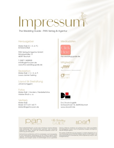 ImpressumDiese CoffeeTableMagazin und alle darin enthaltenen einzelnen Beitr%u00e4gesowie Abbildungen sind urheberrechtlich gesch%u00fctzt. Jede Verwertung au%u00dferhalb der engen Grenzen des Urheberrechtsgesetzes bedarf derZustimmung der Herausgeber. Der Nachdruck von Berichten und Fotos und Anzeigen, auch auszugsweise,ist ohne ausdr%u00fcckliche Genehmigung der PAN Verlag & Agentur GmbH verboten. Druckreif %u00fcbermittelte Unterlagen k%u00f6nnen seitens der Anzeigenabteilung nicht korrigiert werden. F%u00fcr die Richtigkeit, sei es in grammatiHerausgeberKirsten Bu%u00df (V. i. S. d. P.)& Roland Bu%u00dfPAN Verlag & Agentur GmbHM%u00fcnsterstra%u00dfe 12 46397 BocholtT. 02871 2428920info@agentur-pan.dewww.the-wedding-guide.deRedaktionKirsten Bu%u00df | V. i. S. d. P. Laura Janine FastringLayout & GestaltungJohanna EggernFotosKirsten Bu%u00df | Kunden-/ Herstellerfotos Adobe Stock u. a.VertriebKirsten Bu%u00dfMobil: 0171/211 60 71kirsten@agentur-pan.dekalischer, stilistischer, inhaltlicher wie grafischer Form, haftet ausschlie%u00dflich der Auftraggeber/ Inserent. Durch uns gestaltete Anzeigen sind Eigentum des PAN Verlag & Agentur. Eine weitere Ver%u00f6ffentlichung der Anzeigen in anderen Magazinen ist nur nach Genehmigung durch die PAN Verlag & Agentur GmbH m%u00f6glich, die Datenbereitstellung ist kostenpflichtig. (Rechnungsstellung erfolgt an den Anzeigennehmer).Mediadatenthe-wedding-guide.deMitglied im:%u201eAktive Unternehmen im Westm%u00fcnsterlande.V.%u201cD+L Druck+LogistikSchlavenhorst 10, 46395 Bocholtwww.dul-print.deThe Wedding Guide - PAN Verlag & Agentur
