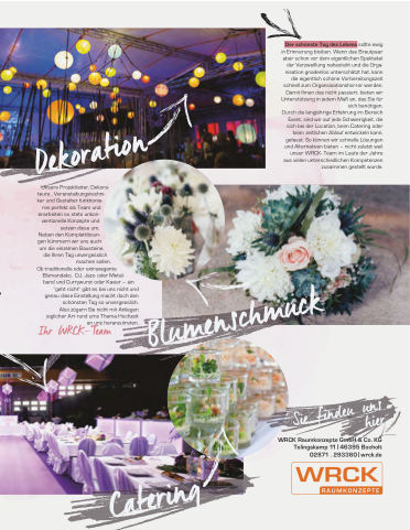 Der schönste Tag des Lebens sollte ewig in Erinnerung bleiben. Wenn das Brautpaar aber schon vor dem eigentlichen Spektakel der Verzweiflung nahesteht und die Orga- nisation gnadenlos unterschätzt hat, kann die eigentlich schöne Vorbereitungszeit schnell zum Organsisationshorror werden. Damit Ihnen das nicht passiert, bieten wir Unterstützung in jedem Maß an, das Sie für sich benötigen. Durch die langjährige Erfahrung im Bereich Event, sind wir auf jede Schwierigkeit, die sich bei der Location, beim Catering oder beim zeitlichen Ablauf entwickeln kann, gefasst. So können wir schnelle Lösungen und Alternativen bieten – nicht zuletzt weil unser WRCK- Team im Laufe der Jahre aus vielen unterschiedlichen Kompetenzen zusammen gestellt wurde.