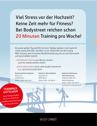 An eurem großen Tag wollt ihr mit einer Topfigur glänzen. Auch wenn ihr vorher wenig Zeit habt, viel dafür zu tun. Bodystreet hat die Lösung: EMS-Training, eine innovative Muskelstimulierung, die aus der Astronautik und Sportmedizin stammt.