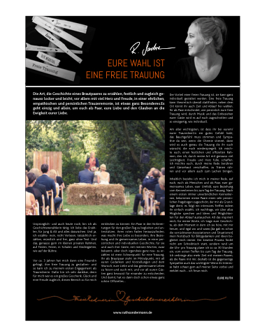 Inhaltlich beziehe ich mich in meiner Rede, auf euch, euch als Menschen und als Paar, euer ge- meinsames Leben, euer Umfeld, eure Beziehung vom Kennenlernen bis zum Tag der Trauung. Nach einem ersten immer unverbindlichen Kennenler- nen, bekommen meine Paare einen sehr persön- lichen Fragebogen zugeschickt, der mir als Grund- lage dient, es folgt ein intensives Treffen indem ihr einfach erzählt, ich nachfrage, wir über alles Mögliche sprechen und Ideen und Möglichkei- ten für den Ablauf austauschen. All das inspiriert mich, für meine Worte, ich trage eure Geschich- te, ab dem Moment in dem ich sie höre, mit mir herum, und egal wo und wann,(da gab es schon die verrücktesten Assoziationen und Situationen) mein Notizbuch für Blitzgedanken und Ideen be- gleitet mich immer. Der kreative Prozess findet nicht am Schreibtisch statt, sondern rund um die Uhr- pro Trauung plane ich so ca. 30 Stunden ein, vom ersten Treffen bis zum Tag der Trauung. Ich verbringe also mehr Zeit mit meinen Paaren, als die Paare mit mir, deshalb ist die gegenseitige Sympathie auch das wichtigste! Wenn ihr Interes- se habt schaut gern auf meiner Seite vorbei und meldet euch... ich freue mich.