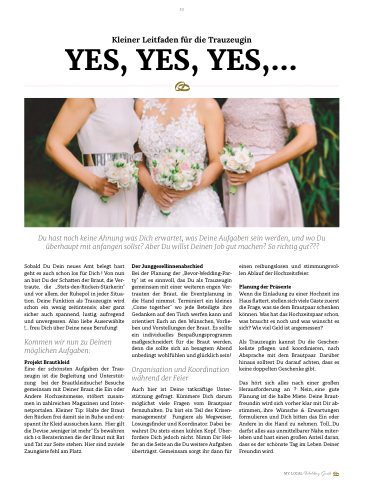 Sobald Du Dein neues Amt belegt hast geht es auch schon los für Dich ! Von nun an bist Du der Schatten der Braut, die Ver- traute, die „Stets-den-Rücken-Stärkerin“ und vor allem, der Ruhepol in jeder Situa- tion. Deine Funktion als Trauzeugin wird schon ein wenig zeitintensiv, aber ganz sicher auch spannend, lustig, aufregend und unvergessen. Also liebe Auserwählte !,.. freu Dich über Deine neue Berufung!