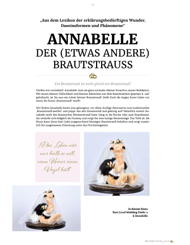 Wir finden Annabelle bietet eine gelungene, vor allem drollige Alternative zum traditionellen „Brautstrauß-werfen“ und peppt das alte Zeremoniell mal gehörig auf! Natürlich ersetzt An- nabelle nicht den klassischen Blumenstrauß beim Gang in die Kirche oder zum Standesamt. Sie versteht sich lediglich als Dummy und sorgt für eine lustige Showeinlage. Das Tolle ist, die Braut kann ihren (mit Liebe ausgesuchten) blumigen Brautstrauß behalten und sorgt zusätz- lich für ausgelassene Stimmung unter den Hochzeitsgästen.
