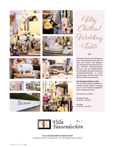Sehr gerne können die Brautpaare nach Terminvereinbarung ganz in Ruhe und exclusiv ihre persönli- che Präsente-Wunsch-Auswahl für ihre Hochzeit zusammenstellen. Prosecco und ein außergewöhnli- ches Wohlfühl-Ambiente lassen das „Hochzeitstisch-Event“ zu einem harmonischen Streifzug durch die Welt der Dekoträume werden.