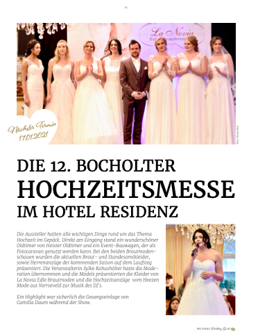 Die Aussteller hatten alle wichtigen Dinge rund um das Thema Hochzeit im Gepäck. Direkt am Eingang stand ein wunderschöner Oldtimer von Heister Oldtimer und ein Event-Bauwagen, der als Fotocaravan genutzt werden kann. Bei den beiden Brautmoden- schauen wurden die aktuellen Braut- und Standesamtkleider, sowie Herrenanzüge der kommenden Saison auf dem Laufsteg präsentiert. Die Veranstalterin Sylke Kohushölter hatte die Mode- ration übernommen und die Models präsentierten die Kleider von La Novia Edle Brautmoden und die Hochzeitsanzüge vom Heezen Mode aus Varrseveld zur Musik des DJ´s.