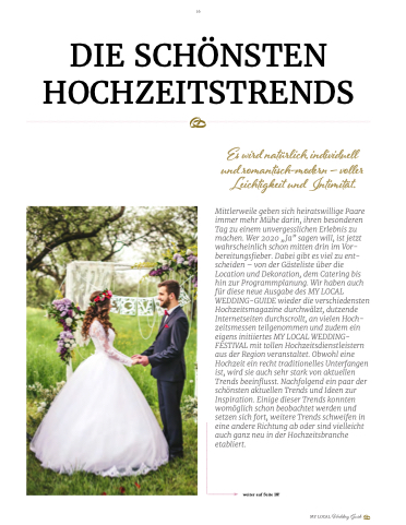 Mittlerweile geben sich heiratswillige Paare immer mehr Mühe darin, ihren besonderen Tag zu einem unvergesslichen Erlebnis zu machen. Wer 2020 „Ja” sagen will, ist jetzt wahrscheinlich schon mitten drin im Vor- bereitungsfieber. Dabei gibt es viel zu ent- scheiden – von der Gästeliste über die Location und Dekoration, dem Catering bis hin zur Programmplanung. Wir haben auch für diese neue Ausgabe des MY LOCAL WEDDING-GUIDE wieder die verschiedensten Hochzeitsmagazine durchwälzt, dutzende Internetseiten durchscrollt, an vielen Hoch- zeitsmessen teilgenommen und zudem ein eigens initiiertes MY LOCAL WEDDING- FESTIVAL mit tollen Hochzeitsdienstleistern aus der Region veranstaltet. Obwohl eine Hochzeit ein recht traditionelles Unterfangen ist, wird sie auch sehr stark von aktuellen Trends beeinflusst. Nachfolgend ein paar der schönsten aktuellen Trends und Ideen zur Inspiration. Einige dieser Trends konnten womöglich schon beobachtet werden und setzen sich fort, weitere Trends schweifen in eine andere Richtung ab oder sind vielleicht auch ganz neu in der Hochzeitsbranche etabliert.