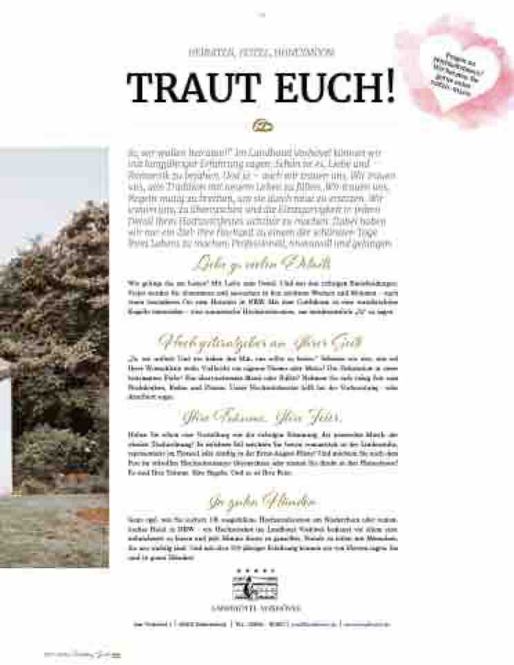 „Ja, wir wollen! Und wir haben den Mut, uns selbst zu feiern.“ Schauen wir also, was auf Ihrer Wunschliste steht: Vielleicht ein eigenes Thema oder Motto? Die Dekoration in einer bestimmten Farbe? Ein überraschendes Menü oder Büfett? Nehmen Sie sich ruhig Zeit zum Nachdenken, Reden und Planen. Unser Hochzeitsberater hilft bei der Vorbereitung - sehr detailliert sogar.