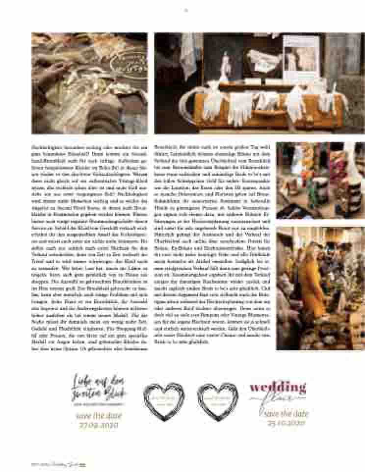 Nachhaltigkeit besonders wichtig oder möchtet ihr ein ganz besonderes Einzelteil? Dann kommt ein Second- hand-Brautkleid auch für euch infrage. Außerdem ge- hören beispielsweise Kleider im Boho-Stil in dieser Sai- son wieder zu den absoluten Verkaufsschlagern. Warum dann nicht gleich auf ein authentisches Vintage-Kleid setzen, das wirklich schon älter ist und nicht bloß aus- sieht wie aus einer vergangenen Zeit? Nachhaltigkeit wird immer mehr Menschen wichtig und so wächst das Angebot an Second Hand Stores, in denen auch Braut- kleider in Kommission gegeben werden können. Ebenso bieten auch einige reguläre Brautmodengeschäfte diesen Service an. Sobald das Kleid vom Geschäft verkauft wird, erhaltet ihr den ausgemachten Anteil des Verkaufsprei- ses und müsst euch sonst um nichts mehr kümmern. Ihr solltet euch nur zeitnah nach eurer Hochzeit für den Verkauf entscheiden, denn von Zeit zu Zeit wechselt der Trend und es wird immer schwieriger, das Kleid noch zu verkaufen. Wer keine Lust hat, durch die Läden zu tingeln, kann auch ganz gemütlich von zu Hause aus shoppen. Die Auswahl an gebrauchten Brautkleidern ist im Netz extrem groß. Ein Brautkleid gebraucht zu kau- fen, kann aber natürlich auch einige Probleme mit sich bringen. Jedes Kleid ist ein Einzelstück, die Auswahl also begrenzt und die Änderungskosten können teilweise höher ausfallen als bei einem neuen Modell. Für die Suche müsst ihr demnach meist ein wenig mehr Zeit, Geduld und Flexibilität einplanen. Für Shopping-Muf- fel oder Frauen, die von klein auf ein ganz spezielles Modell vor Augen haben, sind gebrauchte Kleider da- her eher keine Option. Ob gebrauchtes oder brandneues