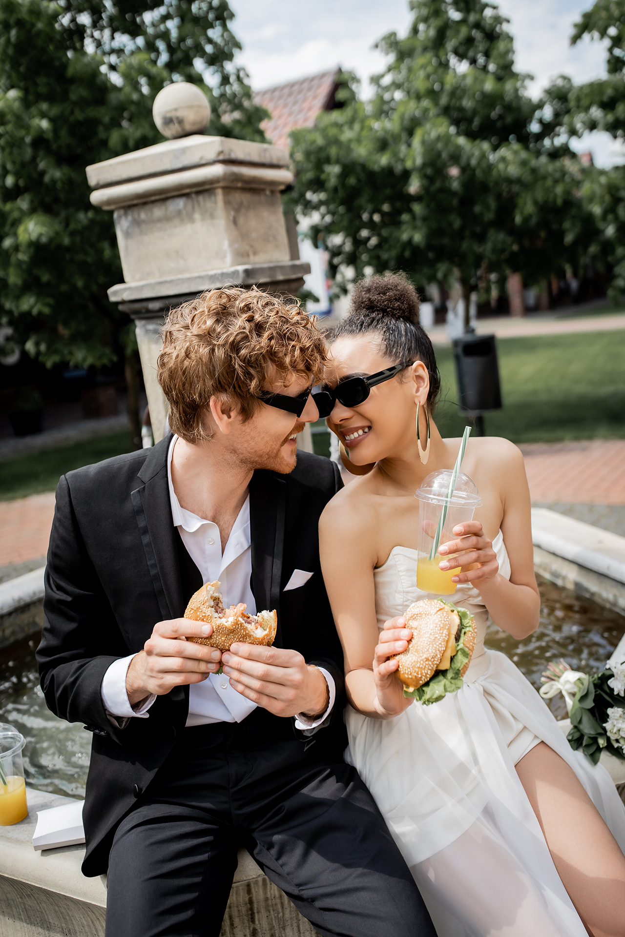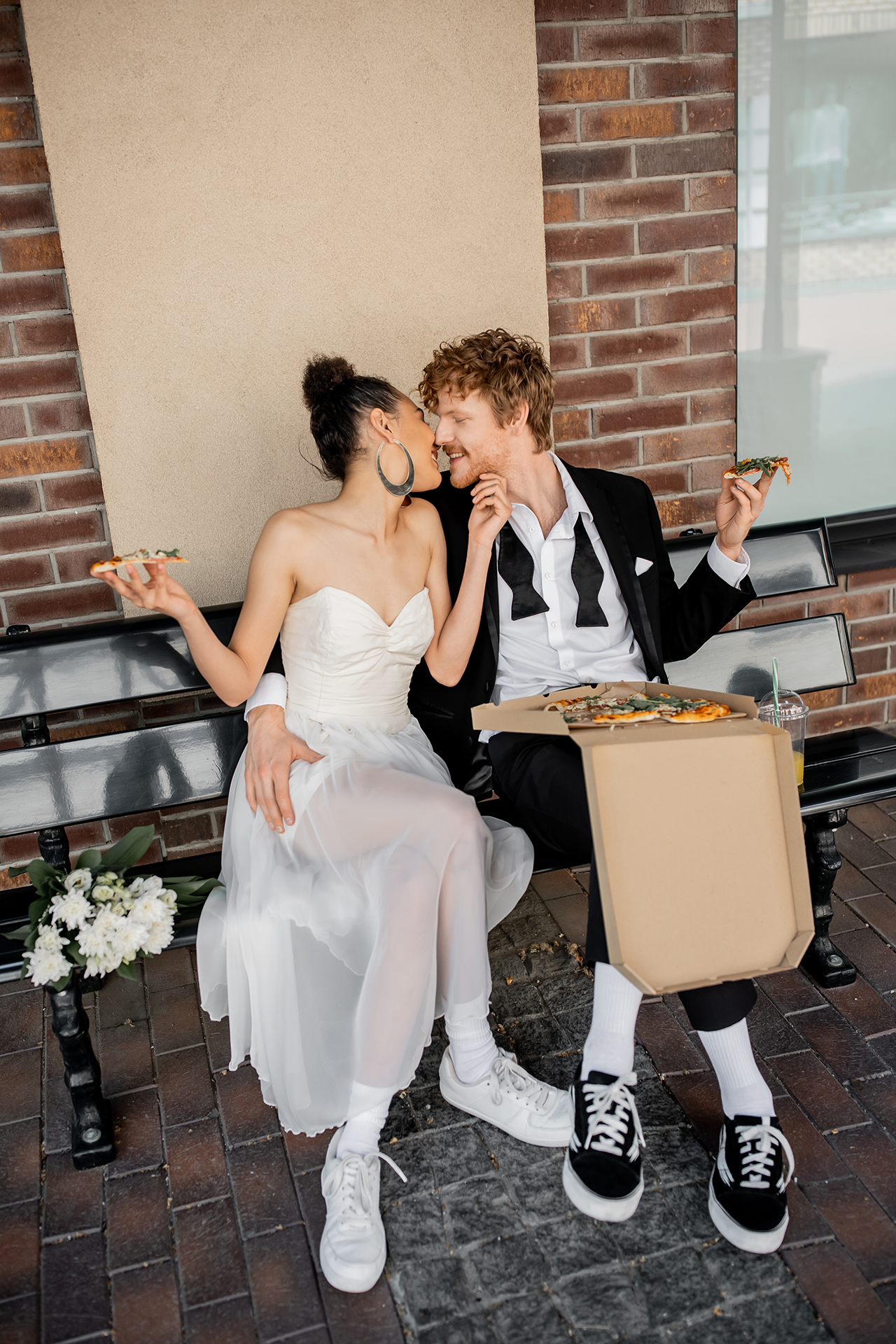 einer eigenen kleinen Blase voller Liebe. Statt eines aufwendigen Hochzeitsmenüs wartet eure Lieblingspizza in der Hand – der perfekte Kontrast zwischen festlich und ungezwungen. In der anderen Hand prickelt ein gut gekühltes Glas Prosecco. Warum? Weil es euer Tag ist, und wenn Pizza und Prosecco euer Traum sind, dann ist das genau richtig!